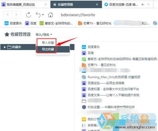 3、進(jìn)入收藏管理器后,我們就能看到一個(gè)百度瀏覽器的收藏夾界面,在界面左上角能看到“導(dǎo)入/導(dǎo)出”選項(xiàng),單擊該選項(xiàng)。