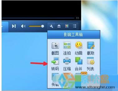 4、點開這圖標有一個影音工具箱,然后點擊下方的“轉碼”。