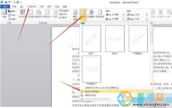 3、給文檔添加一個文字水印效果,點擊頁面布局選項卡里的水印,在下拉菜單中找到自定義水印點擊進入。