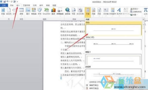 5、給文檔插入一個頁眉,點擊插入,頁眉,選擇空白頁眉,并輸入文字:空氣環(huán)境。