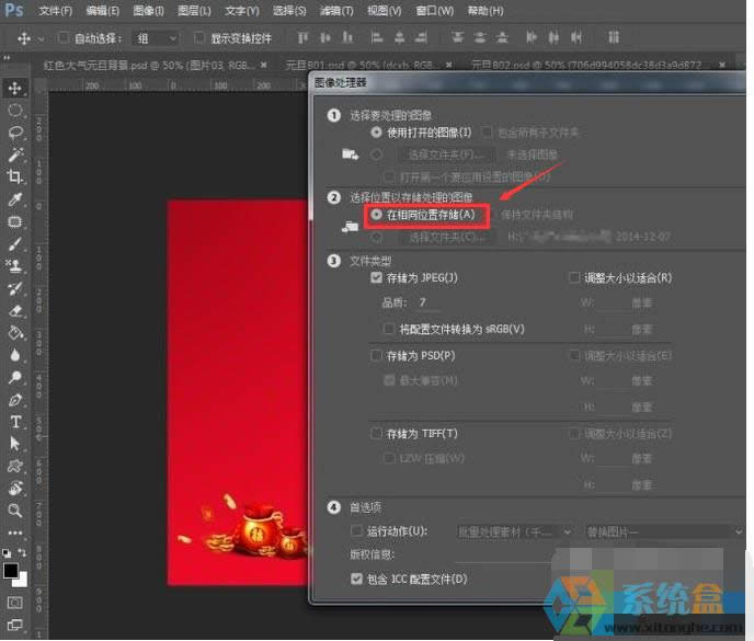 3、選擇我們的保存位置及格式,默認我們將它設為“在相同位置存儲”。執行運行命令,快速將我們PSD的文件轉為JPG圖片。