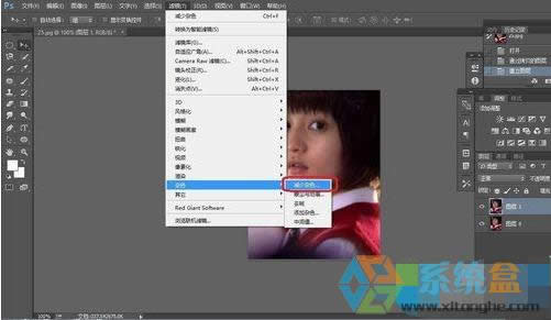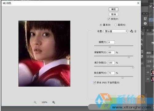 3、這時要先把照片上的雜質去除掉,選擇濾鏡——雜色——減少雜色,其中的數值根據照片上的雜質而定。