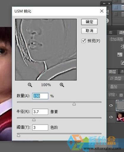 6、然后我們選擇濾鏡——銳化——USM銳化(這個主要是用來提高對比度)數值區間差不多和我的相差不大。