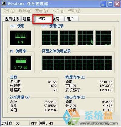 如果下次開機還有這類情況,我們就要看看我們系統(tǒng)是不是中毒或裝了什么流氓軟件導致系統(tǒng)變慢,資源占用較多了。我們處理電腦的問題一定要“先軟后硬”。 我們可以同時按鍵盤上的CTRL+ALT+DEL,調出WINDOWS任務管理器,查看一下CPU的占用情況及內存占用情況。 調出任務管理器后,我們點性能,可以查看CPU,內存的資源占用情況。