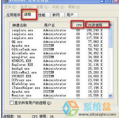 如果CPU占用經常百分之百或內存占用達到百分之7,8十的話,一定是中毒了,這時我們就要全盤殺毒或重裝系統(tǒng)。 我們再點進程欄,查看什么程序占用資源最多,我們可以點CPU和內存使用,進行排序來進行查找。