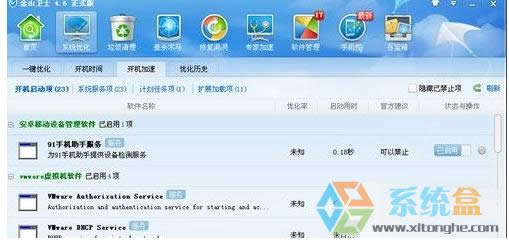 打開金山衛(wèi)士,在系統(tǒng)優(yōu)化-開機加速里可以對一些無關緊要的程序進行啟動禁止。