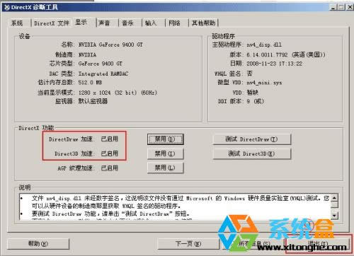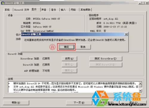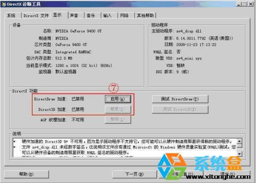 第七步:點擊上方的“顯示”選項卡后,您可看到DirectDraw 和 Direct3D的狀態。如果為“已禁用”,則點擊旁邊的“啟動”,以開啟顯卡的D3D加速功能(本文由 系統盒 http://www.xitonghe.com 整理)。
